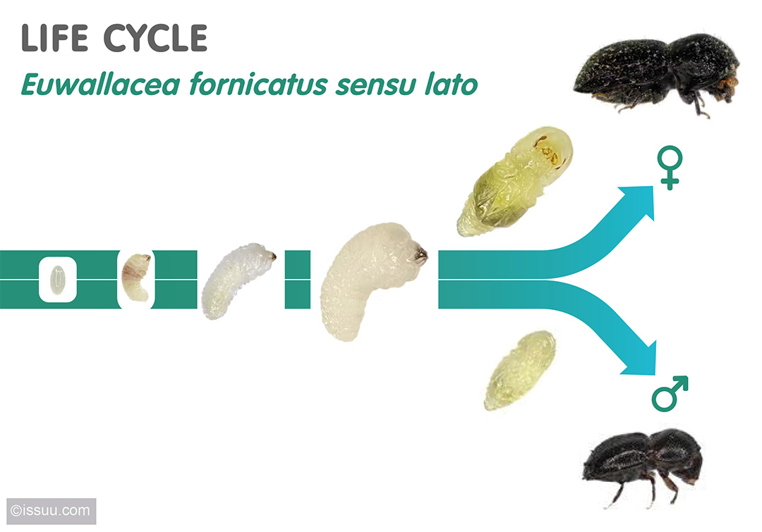 Each stage of Euwallacea fornicatus life cycle is adapted to the morphology of the insect, allowing it to grow in its specific environment, mainly inside tree trunks and in symbiosis with fungi of the genre Fusarium, Graphium and Paracremonium. The eggs of Euwallacea fornicatus sensu lato are small, oval-shaped and white in colour. They are laid by the female inside the galleries she has bored into the wood of trees.