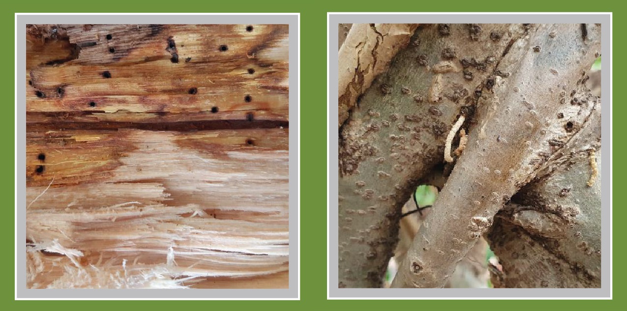 The weakening can be difficult to detect. The most distinguished symptoms are visible on the affected trunks and branches: exudates, foam and/or whitish sawdust shaped as ‘churros’. The tree may show foliar symptoms such as discolouration or premature leaf fall.